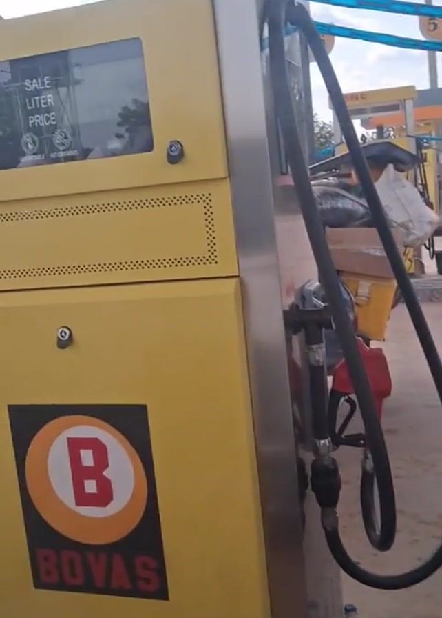 yellow gas pump at a BOVAS gas station. The pump has a black hose and nozzle, and a digital display showing the sale, liters, and price. A fire extinguisher and a black bucket are located beside the pump. The price per liter is 495.88. There is a sign with "NO MOBILE, NO SMOKING" visible.