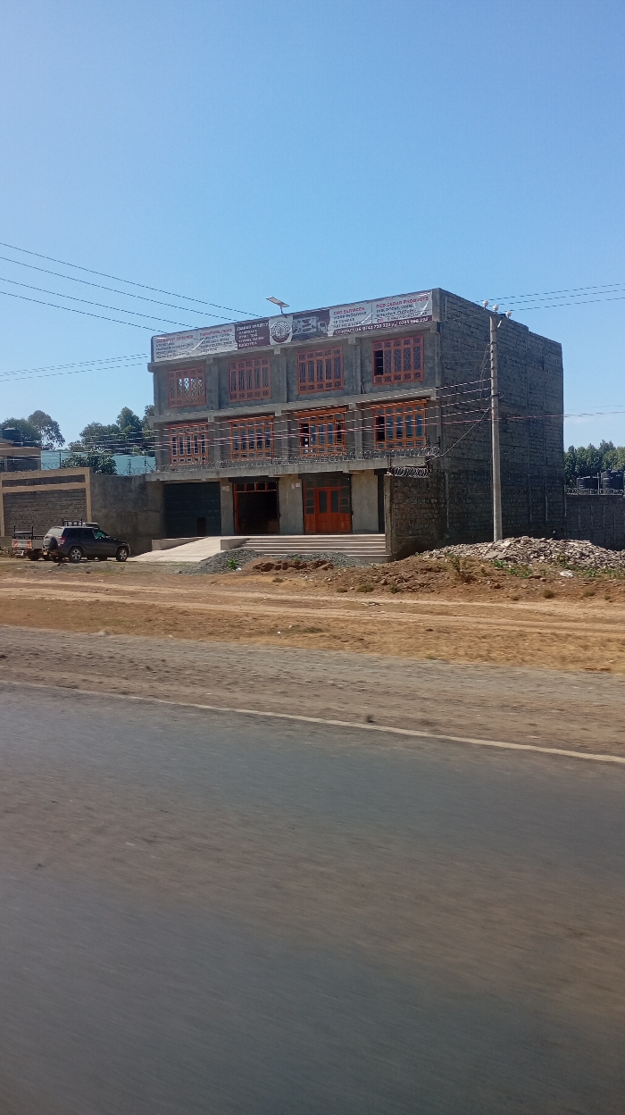 A three-story building stands against a clear blue sky. The structure has multiple windows with wooden frames and two signs atop the building. Below, a brown dirt ground leads to a smooth, concrete entrance with steps and a ramp. A dark SUV with a trailer is parked on the left. In the foreground, a dark, possibly paved road stretches across the bottom of the image. Power lines are visible above the building.