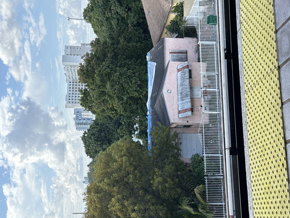 A tall building rises amid greenery under a cloudy sky. A pink house with a tarp-covered roof stands adjacent to a white metal fence. A yellow textured surface runs vertically on the right edge. The house has boarded-up windows and a visible garage door. Trees frame the scene, adding depth and a sense of nature amidst the urban environment.