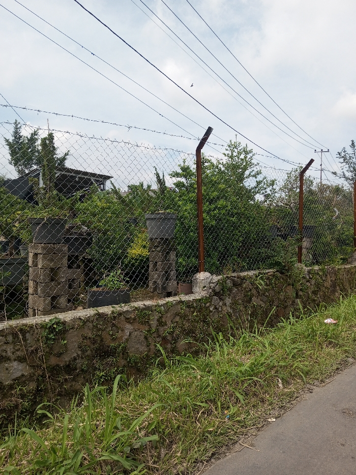 This image depicts an outdoor scene in Namthoung, Laos, characterized by a boundary fence along a paved road. In the foreground, a narrow asphalt road runs along the lower right, bordered by unkempt green and dry grass containing minor litter. Immediately behind the grass is a stone wall, approximately one meter high, exhibiting moss and lichen growth. Surmounting this wall is a chain-link fence, approximately 1.5 to 2 meters in height, topped with multiple strands of barbed wire. The fence is supported by several rusty, dark brown metal posts angled outwards at their tops. Behind the fence, dense green foliage, comprising trees and bushes, obscures the background. Partially visible through the foliage and fence are various objects: to the left, a portion of a building with a dark roof; positioned on the stone wall behind the fence, two structures constructed from concrete blocks, one topped with a dark grey pot; and to the right, a wooden utility pole with crossarms supporting wires. Overhead, numerous electrical or communication wires traverse the frame against an overcast or partly cloudy sky. A small, dark bird is visible in flight in the upper center of the sky. No individuals are present in the scene.