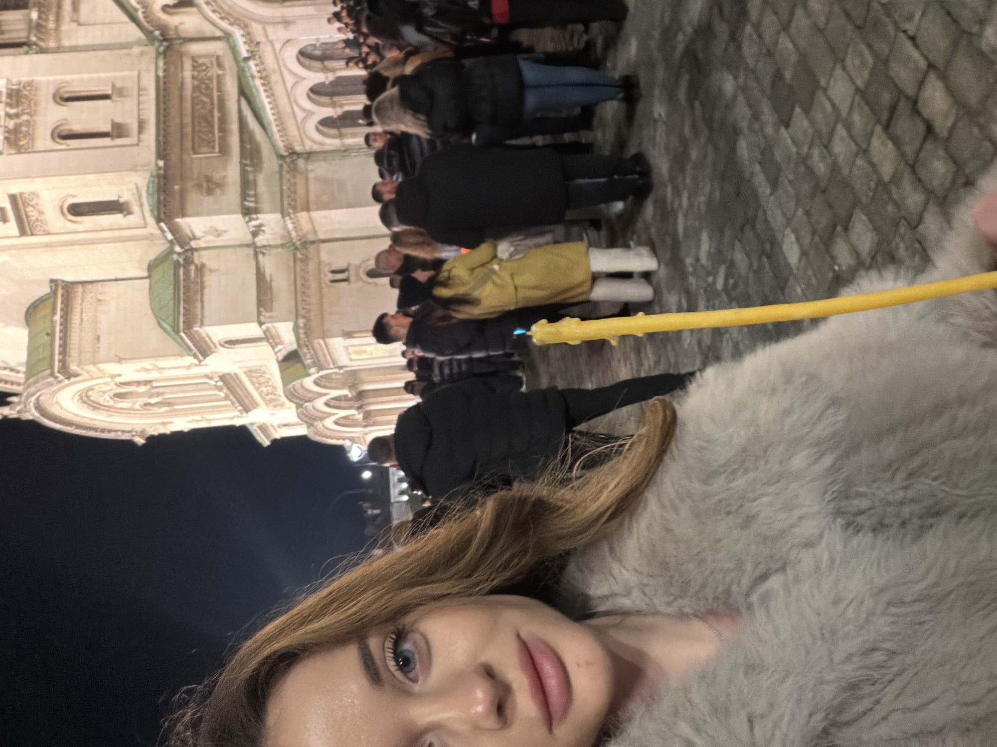 The image depicts a selfie-style shot of a woman holding a lit yellow candle. She has fair skin, long brown hair, and is wearing a grey fur-like coat or garment. In the background, a line of people stands in front of a large, ornate building. The building is illuminated, suggesting it is nighttime. The architectural style is classical, with multiple arches, windows, and detailed ornamentation. The location is the Alexander Nevsky Cathedral in Sofia, Bulgaria. The paving stones in the foreground are a grey cobblestone pattern.
