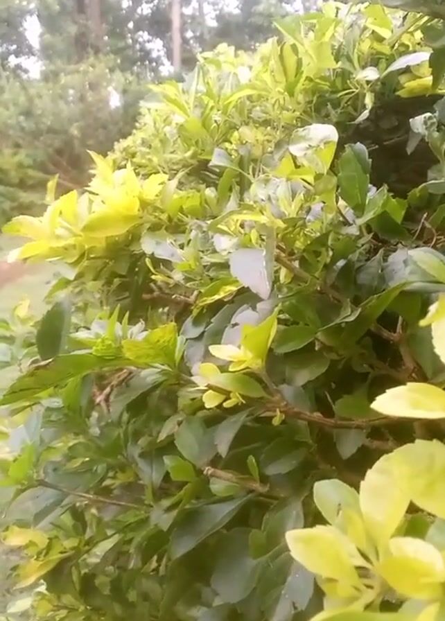 The camera is focused on a green bush with some lighter, yellowish-green leaves