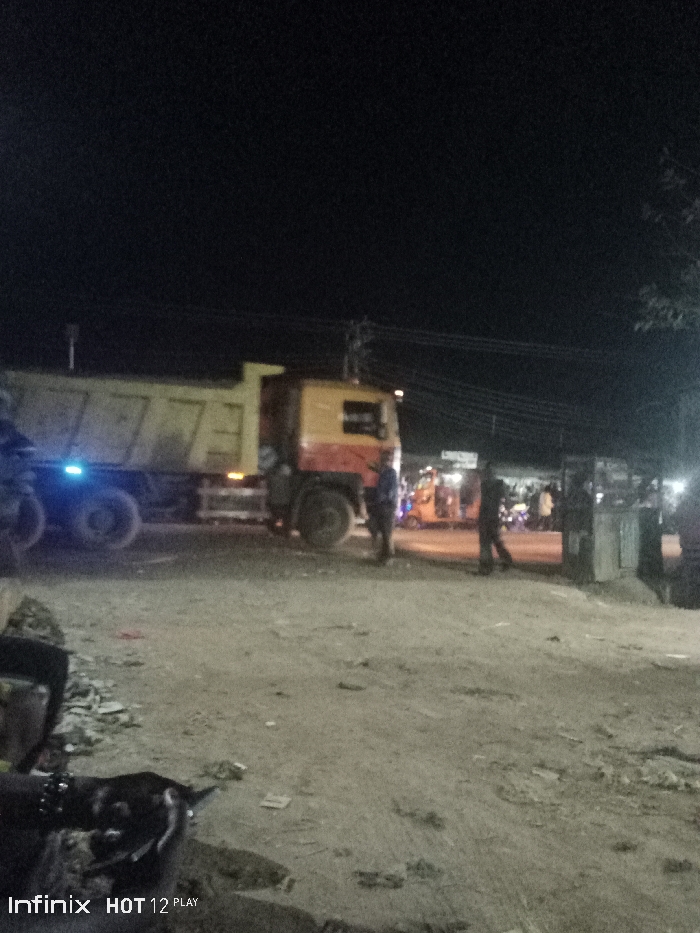 A dump truck sits stationary at night, partially illuminated by its headlights. Two people stand near the truck's cab. In the background, a bustling street scene unfolds with several people and a three-wheeled vehicle visible. The foreground shows a rough, uneven surface, with litter scattered around and a portion of a motorcycle seat visible at the bottom left. The overall scene is captured in low light.