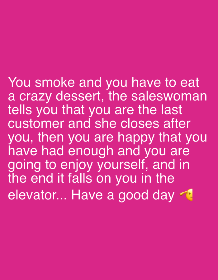 The image displays white sans-serif text centered on a solid, vibrant pink (magenta/fuchsia) background. The text reads: "You smoke and you have to eat a crazy dessert, the saleswoman tells you that you are the last customer and she closes after you, then you are happy that you have had enough and you are going to enjoy yourself, and in the end it falls on you in the elevator... Have a good day". A yellow emoji of a person shrugging is positioned at the end of the text. The image contains no visual representation of a physical scene, individuals, objects, or a specific environment. Therefore, a location in the city of Baan Chaweng, Thailand, cannot be determined from the provided image. The described events and subjects (person smoking, saleswoman, dessert, elevator) are narrative elements within the text and are not visually depicted.