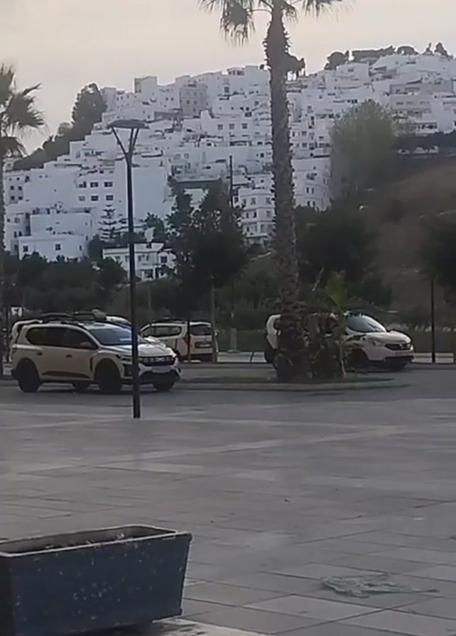 The video depicts a scene in an urban environment, with a collection of white buildings on a distant hillside in the background. In the foreground, a paved plaza is visible, featuring palm trees and various vehicles, including several cream-colored SUVs, presumably taxis. The scene is captured during daylight, with a slightly overcast sky providing muted lighting. The plaza is clean and appears well-maintained, containing planters and a modern lamppost. The cars are parked or slowly moving along a road bordering the plaza.