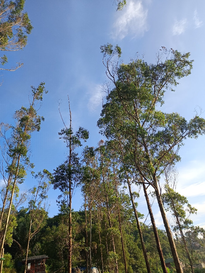 This image presents an upward-angled view into a canopy of numerous tall, slender trees, likely Eucalyptus species, under a clear blue sky with scattered white cirrus clouds. The trees exhibit green foliage, with several showing partial defoliation or bare branches extending towards the sky. A dense green hillside covered in additional trees and vegetation forms the lower background. In the lower-left quadrant, partially obscured by foreground trees, a small wooden cabin or dwelling with a dark roof and a visible porch structure is present. Another smaller, partially visible structure with a greenish roof appears through the trees in the mid-ground, slightly right of center. No human figures or discernible actions are present. The scene depicts a natural, forested or semi-forested environment in a rural setting within the city of Unknown, Indonesia.