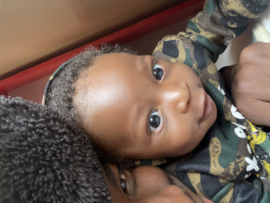 The image presents a close-up view of an infant and a partially visible adult, located indoors in Jos, Nigeria