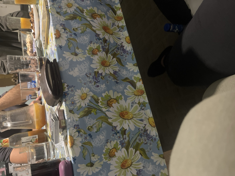 - "The image depicts an indoor scene in Byala, Bulgaria, focused on a rectangular table covered with a light blue tablecloth patterned with white and yellow daisies, blue accent flowers, and faint white butterfly motifs" by FM-ICRGR2, licensed under CC BY 4.0