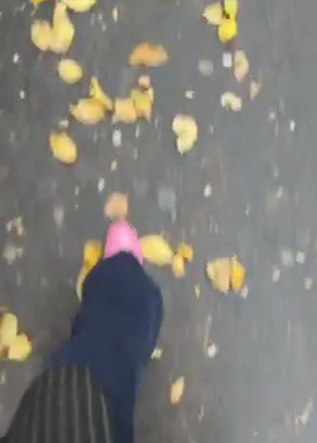 A person wearing a black coat and pink shoe walks on a grey pavement covered in fallen yellow leaves. The camera is positioned looking down at the person's feet as they move forward. The focus is on the shoe and the fallen leaves on the ground.