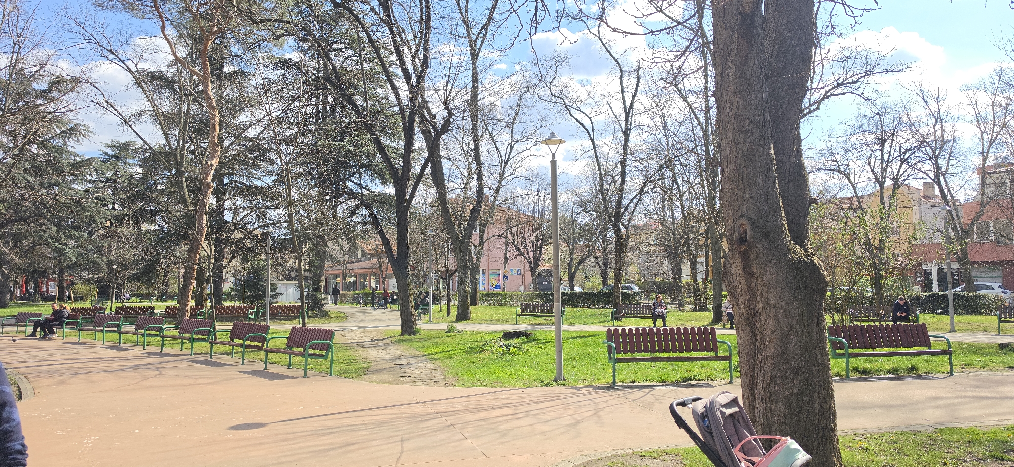 The image depicts a park in Kazanlak, Bulgaria on a sunny day. The scene includes rows of green and brown benches along a brown paved path, with grass and bare trees in the background. There are several people visible, some sitting on benches, others walking. A street lamp stands near one of the paths. In the foreground, partially obscured by a thick tree trunk, is a baby stroller. Buildings with red and yellow roofs are visible in the background.
