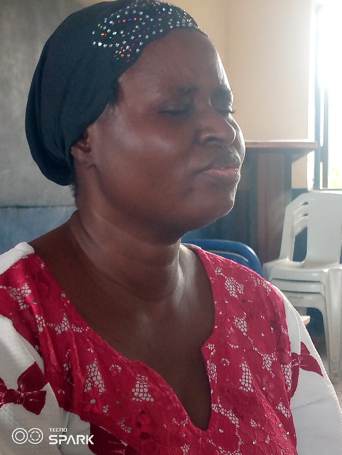 A middle-aged woman with brown skin and a serene expression is centered in the frame. She wears a black head covering adorned with sparkly stones. Her red and white patterned blouse adds color to the scene. Her eyes are closed, and her face is slightly tilted upward. In the background, stacked white plastic chairs and glimpses of a window suggest an indoor setting, possibly a church or meeting hall. The "TECNO SPARK" watermark is visible in the bottom left corner.