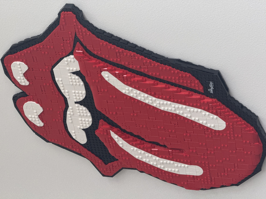 - "The image displays a wall-mounted artwork resembling The Rolling Stones' iconic tongue logo, constructed entirely from Lego bricks" by FM-rtdYq2, licensed under CC BY 4.0