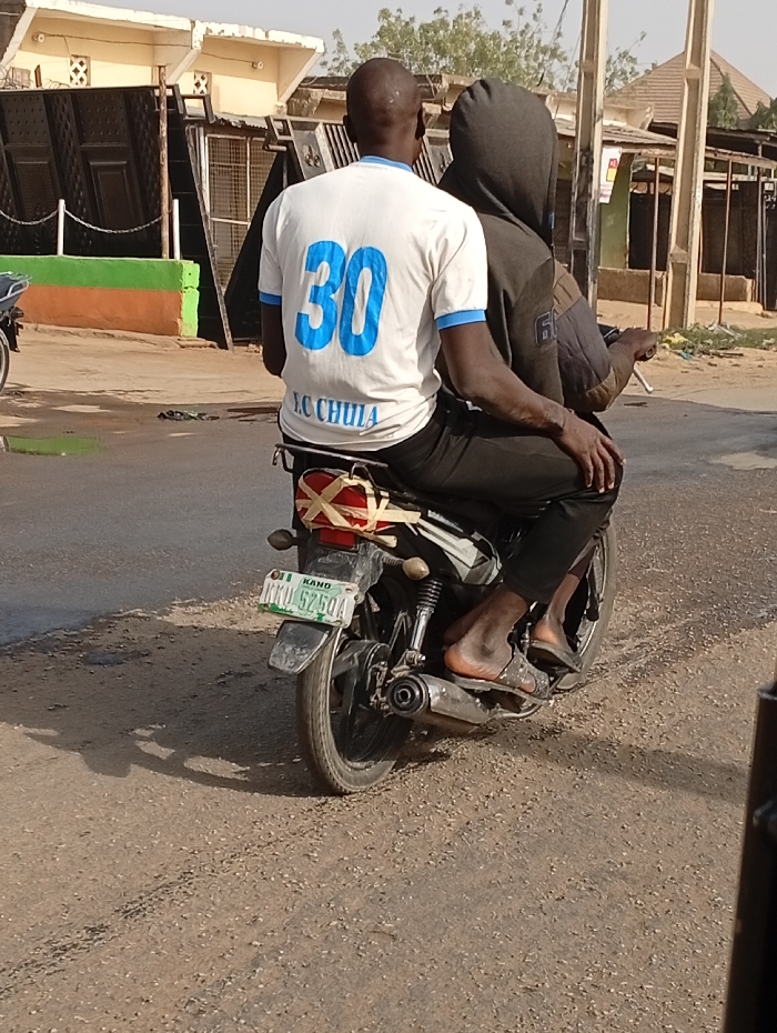 - "Two males are observed from behind, riding a dark-colored motorcycle on a light brown, unpaved road in Gayawa, Nigeria" by FM-asM423, licensed under CC BY 4.0