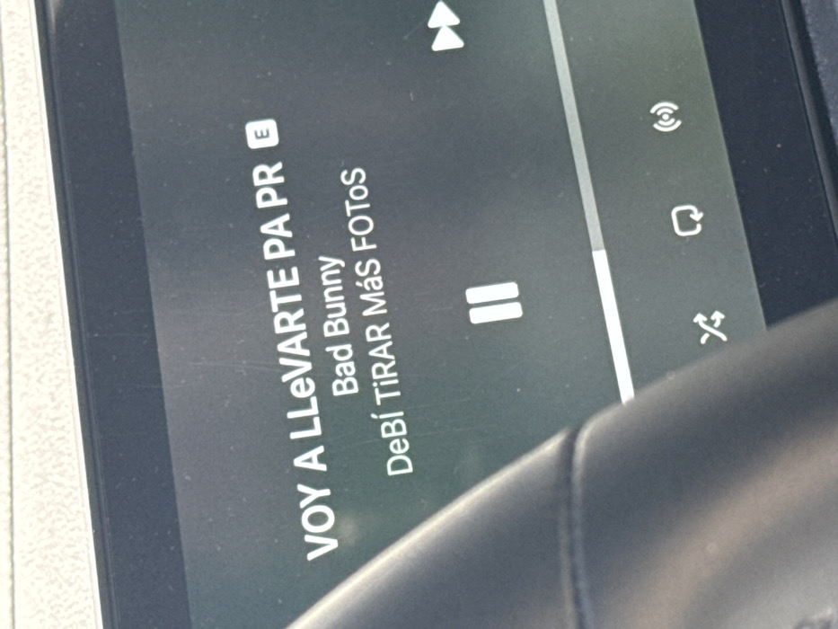 screen displaying the song "VOY A LLEVARTE PA PR" by Bad Bunny. The song title is followed by the artist's name. Below this, the subtitle reads "DEBÍ TIRAR MÁS FOTOS". The screen displays the music player interface, with a pause button, the volume slider, and icons for Wi-Fi, repeat, and shuffle. Part of a steering wheel is also visible.