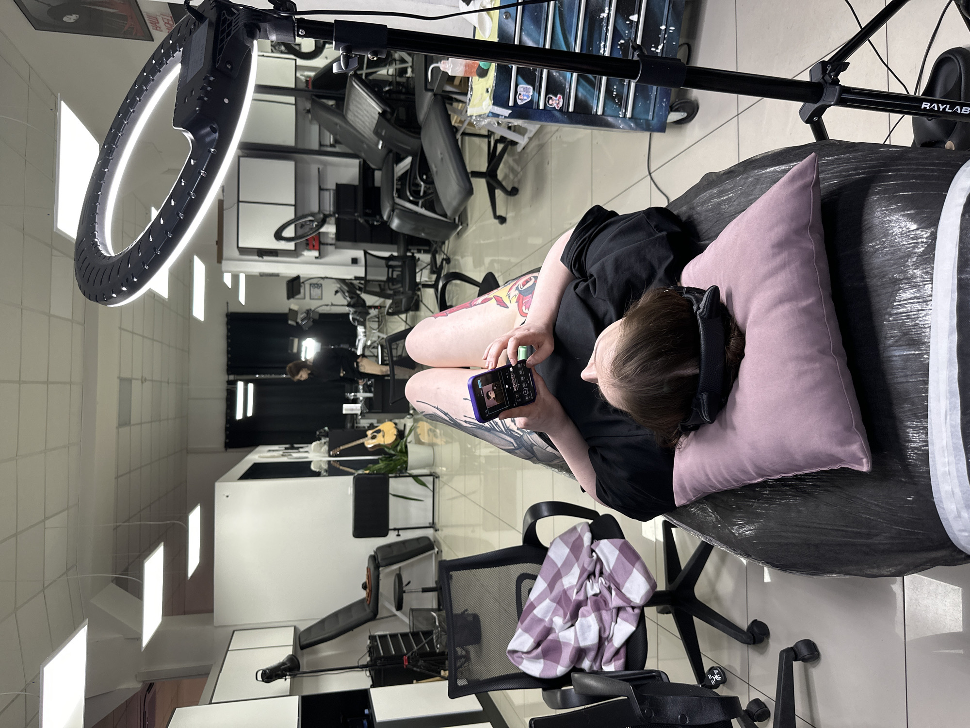 A wide-angle, eye-level shot depicts a person lying on a tattoo chair in a brightly lit tattoo studio. The individual is reclined on a black covered surface with a lilac pillow and is operating a smartphone held in their hands. A large ring light on a stand is positioned above them. The studio features a polished tile floor and white walls with multiple recessed lights. Various chairs and equipment are visible, including tattoo workstations and a guitar stand with a guitar. The scene suggests the subject is either receiving a tattoo or possibly relaxing during a break in a tattoo session. Based on the metadata, the location is Rostov-on-Don, Russia.