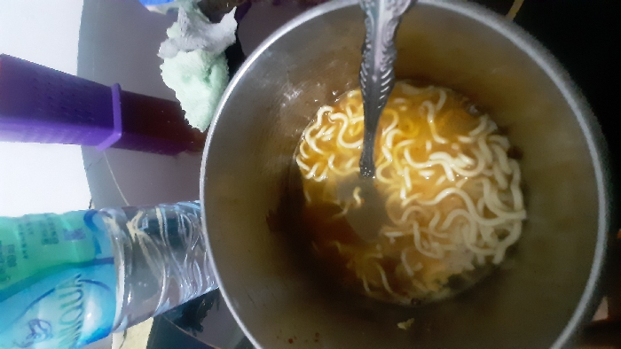 A close-up, elevated view captures a meal preparation or consumption scene on a dark, reflective table surface, likely indoors in Lhokseumawe, Indonesia. The central focus is a silver-colored metal bowl containing instant noodles immersed in a yellowish-orange broth. A silver metal fork with an ornate handle is partially submerged in the noodles, resting at an angle. To the upper left, a clear plastic bottle of "AQUA" brand mineral water stands partially filled. To the upper right, a dark purple, rectangular plastic container or cup is visible, alongside a crumpled light green cloth or paper towel. The background consists of a plain white wall. No people are visible.