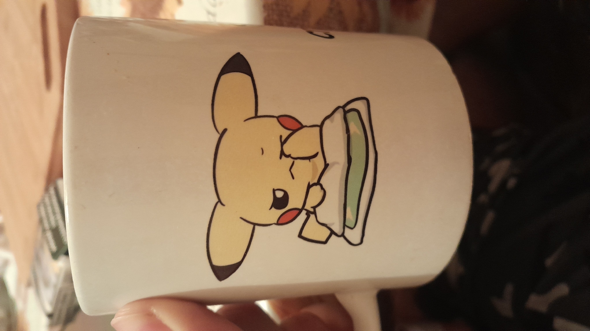 A white mug is held in someone's hand. The mug has a cartoon drawing of Pikachu on it. Pikachu appears to be wiping its eyes with a white towel. The background is blurry, but appears to be indoors. The location in Svishtov, Bulgaria is unknown.