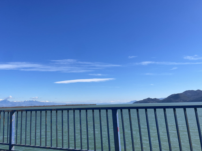 The image depicts a panoramic view of a large body of water, possibly a lake or bay, captured from Kruševica, Montenegro. In the immediate foreground, a dark blue metal railing composed of vertical bars extends horizontally across the lower third of the frame. Beyond the railing, the tranquil water, appearing teal-green, occupies the midground. The water's surface exhibits minimal ripples. In the distant background, a low-lying, dark strip of land separates the water from a range of mountains. To the left, these mountains display snow-capped peaks, indicating higher elevation or colder conditions. To the right, the mountains are darker, appearing forested or rocky without snow. The sky above is a clear, vibrant blue, occupying approximately the upper two-thirds of the image. Scattered high-altitude cirrus clouds are visible, with one distinct, elongated white cloud prominently situated in the central left portion of the sky. No individuals, vessels, or specific actions are discernible.
