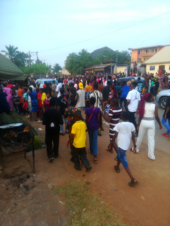 A crowd of people gathers on a dirt road in a residential area. A makeshift tent sits to the left of the frame next to a grill with food cooking. Children and adults are mixed in the crowd, dressed in various colors. Several buildings are visible in the background, and cars are parked on the side of the road. The sky is overcast.