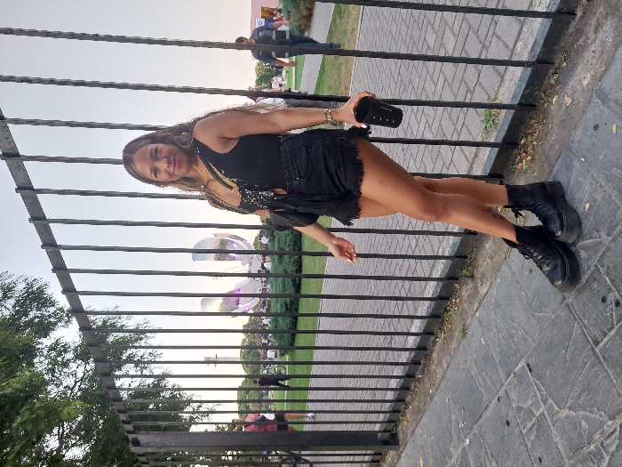 A young woman is positioned near a black metal fence. She wears a black top, shorts with frayed edges, and black boots. She holds a black cylindrical object in her right hand. A park setting stretches behind the fence, with people and illuminated spherical shapes visible in the background. The photo is taken at an angle, with the woman and fence diagonal in the frame. The ground beneath her feet appears to be tiled or paved.