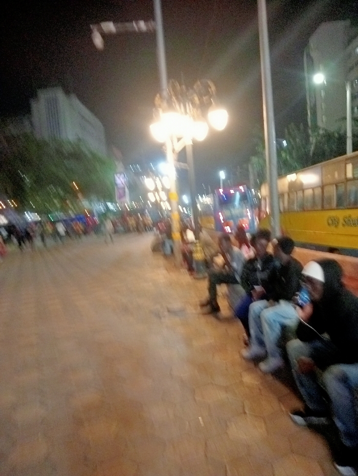 This is a nocturnal image of an urban street or pedestrian area in Nairobi, Kenya. The scene is illuminated by numerous artificial light sources, including ornate streetlights with multiple bulbs and vehicle lights. In the foreground and midground, a wide paved area, likely a walkway or plaza, is visible, constructed from interlocking blocks. On the right side of this paved area, a group of at least five male individuals are seated or leaning against an unseen structure, facing towards the left. The person closest to the viewer wears a black hoodie and a white cap, actively engaged with a brightly illuminated mobile phone. Another individual next to them also uses a mobile phone. The individuals are casually dressed in jeans and hoodies. To the right, a large yellow bus is partially visible, displaying the text "CITY SHUTTLE" on its side, identifying it as a local public transport vehicle in Nairobi. Further down the street, a blue or red vehicle with illuminated headlights is visible. In the distant left midground, a blurry crowd of pedestrians is present. Multi-story buildings are visible in the background, partially obscured by trees and the darkness, with some interior lights visible. The overall image exhibits motion blur, particularly affecting distant subjects and vehicles, indicating low light conditions.