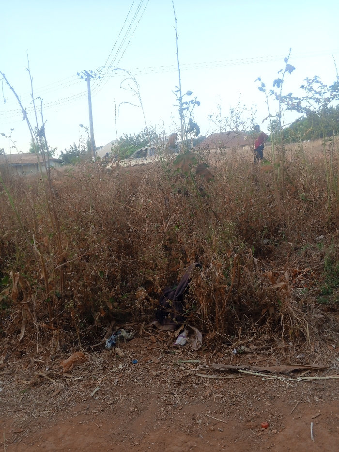 A field of tall, dry weeds and grasses fills the frame. Trash and debris scatter the ground at the base of the vegetation. A person in a red shirt walks along a path in the distance. Beyond the field, a white vehicle and rooftops are visible. Power lines and a utility pole stretch across the sky. The ground is reddish-brown, suggesting a dirt or clay surface.