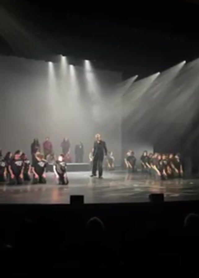 A medium shot from an audience perspective shows a stage performance. A group of people are on the stage, some on their knees and others standing. The kneeling people are mostly wearing black t-shirts, while the standing individuals have various attire. A man in a suit walks among them. The stage is lit with bright spotlights cutting through smoke or fog. The audience is visible in the foreground as dark silhouettes.