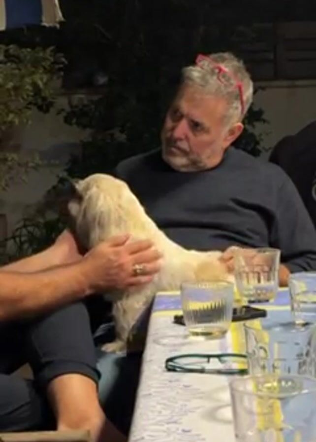 At a table, outdoors at night, a man with a gray beard and red sunglasses on his head sits in a navy shirt, looking at a small cream-colored dog. Another man is petting the dog, which stands on the first man's lap. The table is set with glasses and a blue and yellow patterned tablecloth. The overall setting suggests a casual, intimate gathering.
