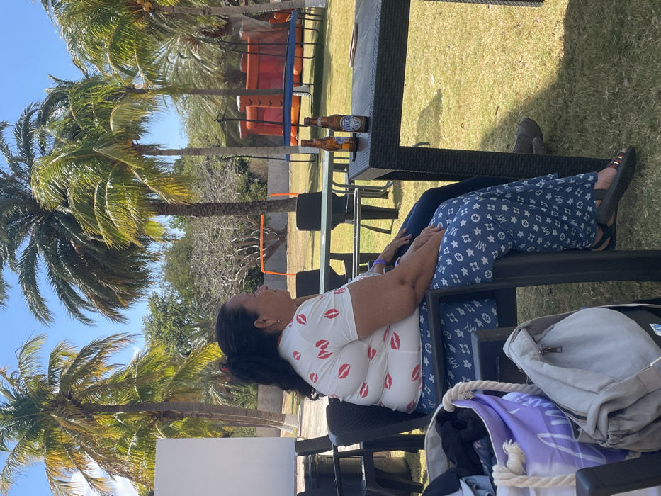 The image displays an outdoor recreational area under a clear blue sky, consistent with the specified location of San Juan Bautista, Venezuela. The ground is covered in green grass, with numerous tall palm trees and other foliage visible in the background. In the foreground, an adult female is seated in profile, facing right, in a dark, textured outdoor chair. She has dark hair pulled back into a ponytail and is wearing a white short-sleeved top with a repeating red lip pattern. Her lower attire consists of blue full-length trousers or a skirt with a repeating white pattern featuring "MY" and star/flower motifs. She wears dark sandals with a metallic accent on her feet. Her hands are resting in her lap. To her left, a large light purple tote bag with a rope handle and a grey backpack are visible. Behind the seated female, the lower body of a second individual is partially visible, seated in another dark outdoor chair. This person wears dark blue jeans and dark shoes, with a purple wristband visible on their right wrist. To the right of the primary subject, a dark rectangular outdoor table holds two upright glass bottles of "Polar" beer. In the midground, several other dark tables and chairs are visible on the grass. The background features recreational equipment, including an orange inflatable bouncy castle, a blue trampoline, and a small orange goal post. A large white screen is present on the far left side of the background.
