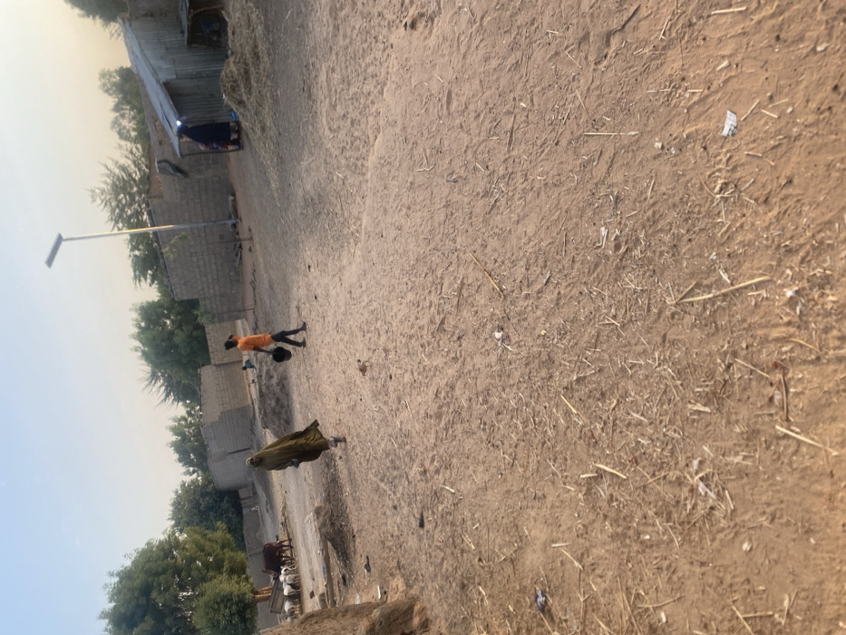 A village scene under a clear sky. A boy in an orange shirt carries a black object. A woman in a green wrap walks toward the viewer. Simple block structures, possibly houses, line the path with a solar light pole visible. A group of livestock stands near trees, indicating a rural setting. The ground is dry and dusty.