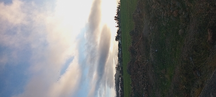 The image depicts a rural landscape in Ait Naamane, Morocco. The scene is dominated by a partially cloudy sky, transitioning from light blue in the upper left to a bright, sun-illuminated cloud formation on the right, suggesting either sunrise or sunset. Five small, dark avian silhouettes are visible flying in the upper left quadrant. The midground features a large, level green field. Beyond this field, a distant village or settlement with scattered buildings and trees is observable, backed by a low-lying hill range on the far left. The immediate foreground consists of uneven, uncultivated terrain composed primarily of dark earth and numerous brown rocks, with sporadic patches of sparse green vegetation. No individuals, specific actions, or interactions are discernible within the frame.