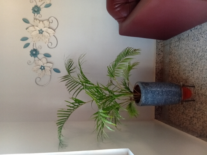 The scene depicts an interior corner of a room located in Lokoja, Nigeria. A light-colored wall forms the background, with a perpendicular light-colored wall extending to the left where a narrow vertical opening, possibly a window frame, is visible. The floor is covered with speckled grey and white tiles. Dominating the corner is a tall, leafy green plant, resembling a parlor palm, housed within a cylindrical, textured dark grey planter. The planter rests on a minimalistic dark metal stand, beneath which a red circular saucer is positioned. Mounted on the right-hand wall, above the plant, is a decorative metal wall sculpture. It features a horizontal arrangement of three larger cream-colored flowers and two smaller teal-colored flowers, interconnected by swirling silver metallic vines and small teal leaf-like accents. Each flower center contains a small, reflective embellishment. On the far right, a segment of a burgundy or dark red upholstered armchair or sofa is visible, showing a smooth side panel and a portion of a tufted backrest. No individuals are present in the frame. The lighting appears even, suggesting an indoor setting with ambient light.