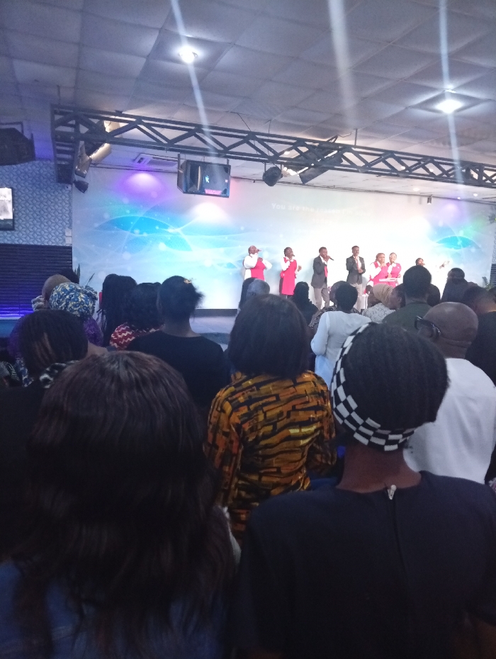 A large group of people face a stage, their backs to the camera. On the stage, a choir of about eight members, dressed in red or gray suits and dresses, sing with microphones. A large screen behind them displays abstract blue and purple patterns with white text. A lighting rig hangs above the stage. The room appears to be a church or auditorium, illuminated with bright overhead lights.