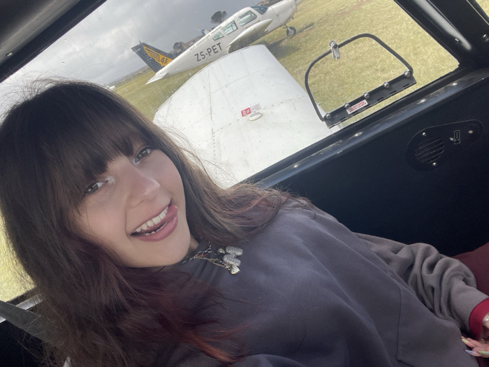 The image is a selfie taken from inside the cockpit of an aircraft at Port Alfred Airport, Port Alfred, South Africa