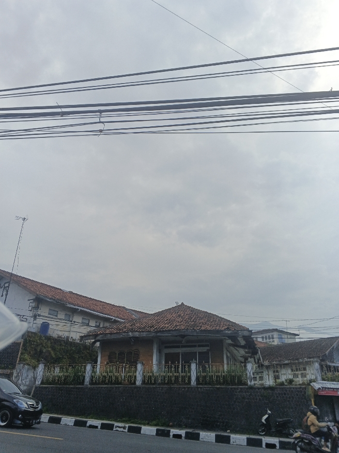 The image displays a street scene in Kon Tum, Vietnam, observed under an overcast sky dominated by multiple horizontal electrical lines. In the foreground, a two-lane asphalt road, delineated by a black and white striped curb, features a black minivan or SUV partially visible on the left and a light-colored scooter ridden by a single individual in a light-colored jacket on the right. A low stone wall, topped with a decorative gold-painted metal fence and green foliage, separates the road from a single-story building. This building has a reddish-brown tiled hip roof, which shows signs of weathering and minor damage to the eaves. Its facade includes a large glass window or door section and another section with what appears to be decorative screen work or fixed shutters. Behind this structure, to the left, a larger multi-story building with a similar tiled roof is partially visible, featuring a prominent vertical antenna on its roofline and a blue barrel or tank on its side. To the right, another building with a tiled roof is situated further back, appearing partially dilapidated, and a small red-roofed kiosk is present near the roadside. Faint outlines of distant hills are visible against the cloudy horizon.