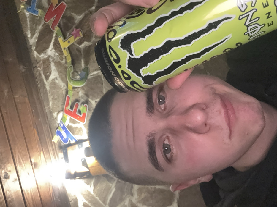 A close-up photograph depicts a male individual holding a beverage can. The subject, a young adult male, has short dark hair and light-colored eyes, and exhibits a slight smirk. He wears a dark hooded garment. His left hand holds a lime green Monster Energy drink can, featuring the black claw logo and the name "LANDO NORRIS" printed on the top rim. The can is positioned in front of his face, partially obscuring the right side. The background consists of an interior wall constructed from irregular stone masonry, with horizontal wooden planks visible above it. A bright light source is situated in the upper left background. A string of colorful decorative letters, partially visible as "YE C T N", hangs across the background. The specific location within Berkovitsa, Bulgaria, is not discernible from the visual evidence in the image.