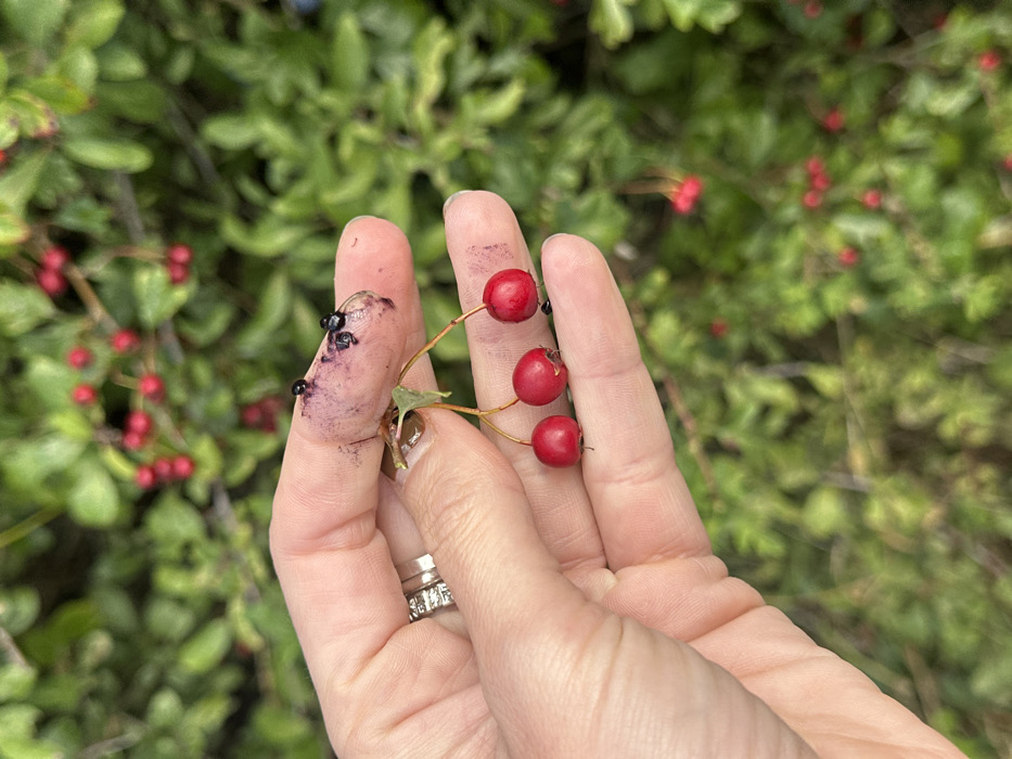 - "A close-up photograph captures a human left hand holding a cluster of three bright red berries, consistent with hawthorn haws, on a short stem" by FM-13LyK2, licensed under CC BY 4.0