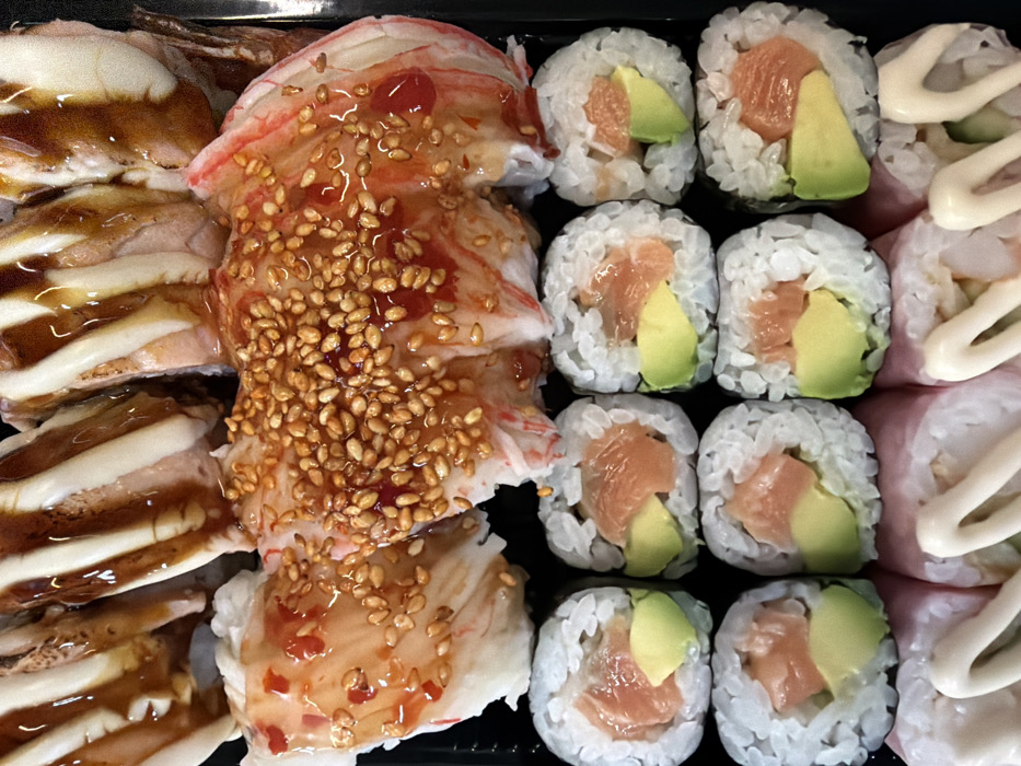 - "The image displays a close-up, overhead view of a sushi assortment presented in a black plastic takeout container, located in Vratsa, Bulgaria" by FM-cheYL2, licensed under CC BY 4.0