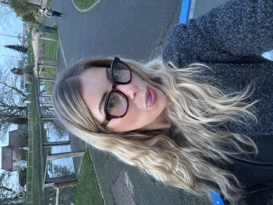 A blonde female subject is captured in a close-up selfie, positioned to the left and center of the frame