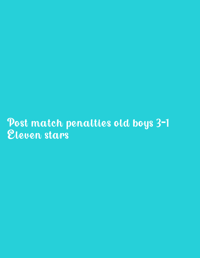 The image displays a turquoise background with the text "Post match penalties old boys 3-1 Eleven stars" in a cursive, white font