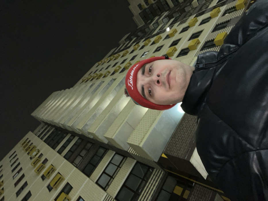 An adult male is depicted in a low-angle nighttime selfie taken outdoors