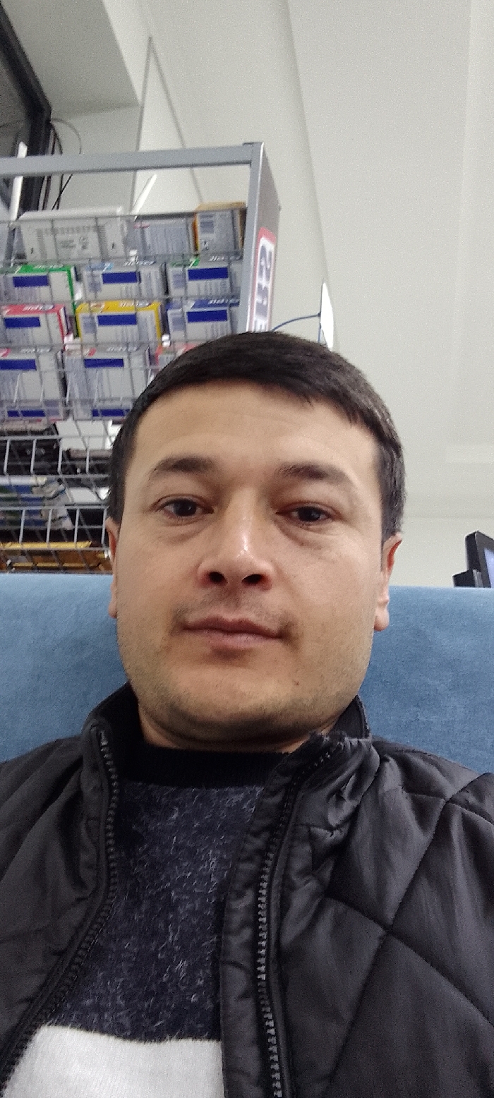 A man takes a selfie indoors, presumably in a shop, sitting on a blue cushioned bench. A black quilted jacket is visible over a patterned sweater, with a white shirt or undergarment partially showing. Behind the man is a retail display rack stocked with various boxed items and the upper corner of a computer monitor. The ceiling appears to be white with fluorescent lighting.