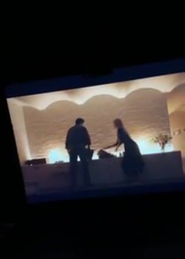 scene on a laptop screen of a woman with long blonde hair talking to a man whose back is to the camera. The scene appears to be indoors with light colored walls in the background. The camera zooms in on the woman. The laptop's keyboard is visible.