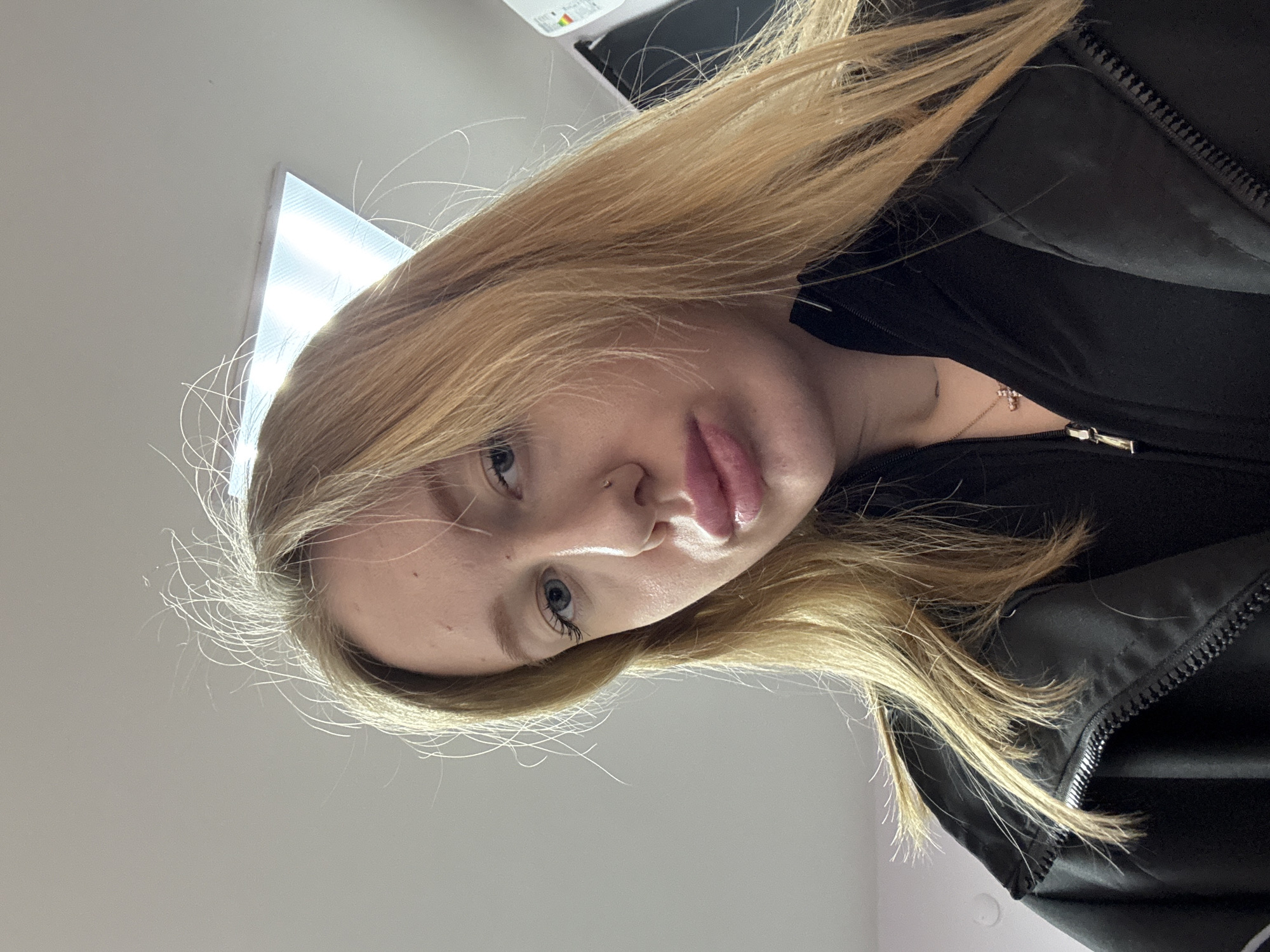 A close-up selfie of a fair-skinned young woman with long, light-blonde hair is positioned against a pale gray wall. The woman is wearing a black hooded jacket, and a gold necklace with a cross pendant is visible at her neckline. Her facial features include light blue eyes, a small nose piercing, and slightly parted lips. Overhead fluorescent lighting is evident in the background, suggesting an indoor environment. There is no evidence in the picture to locate the city as Ovoshchnoy, Russia.