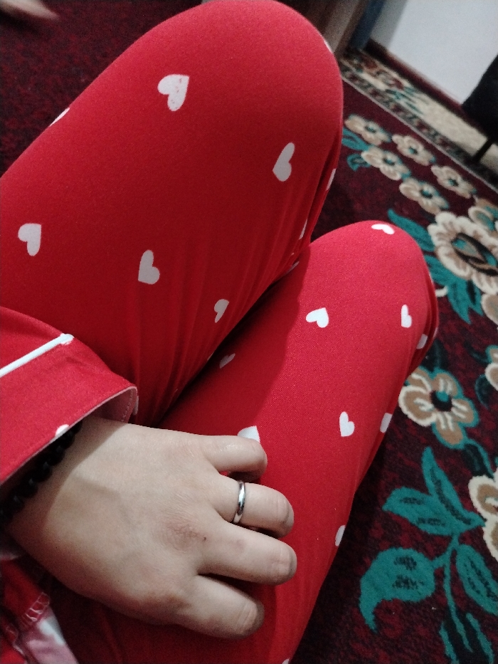 A person wearing red and white heart-patterned leggings sits on a patterned carpet. The individual is wearing a red pajama top with white trim. On their left hand, a silver ring is visible. The hand also has a black beaded bracelet. The carpet features a dark red background with floral patterns in white, green, and brown.