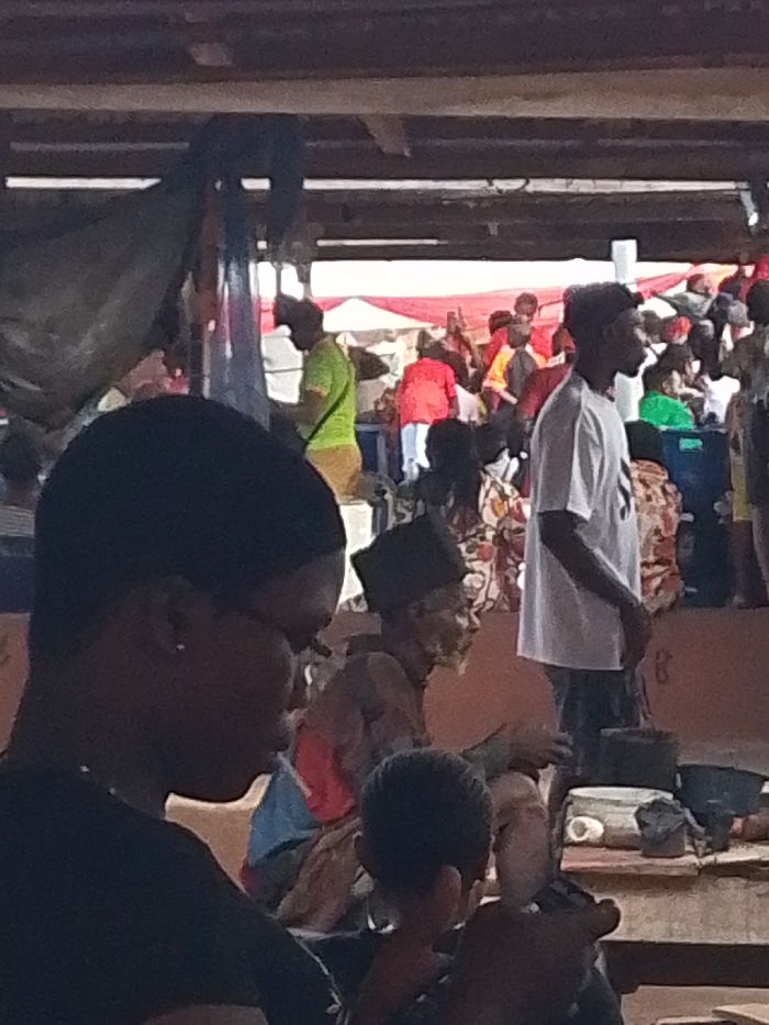 An image depicts a bustling indoor or covered public gathering in Alor, Nigeria