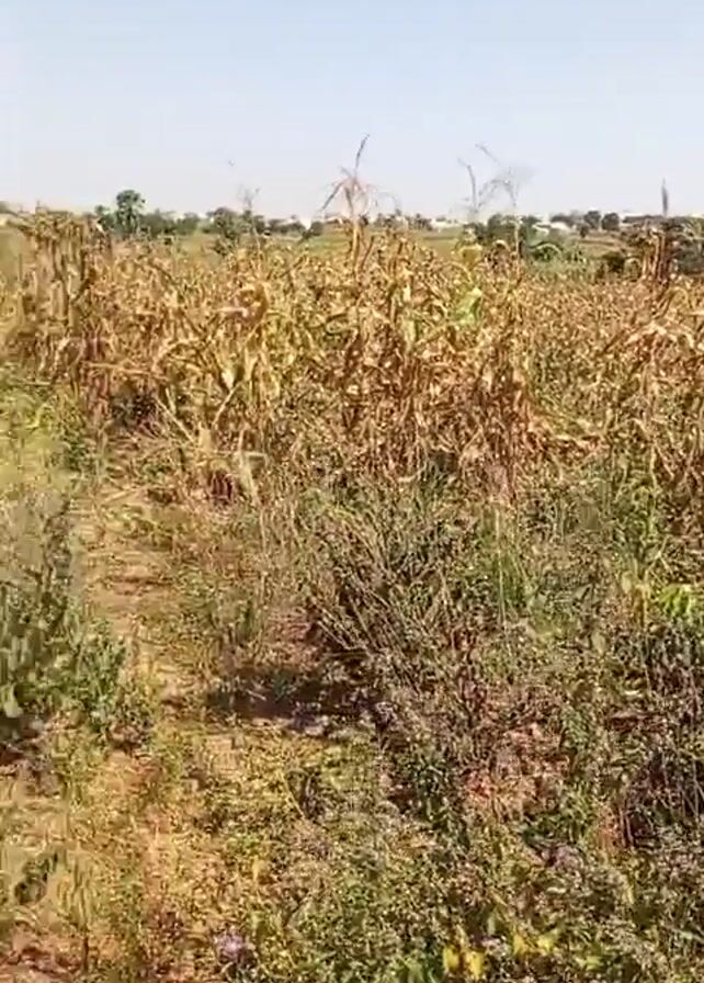 field of dry corn stalks and weeds