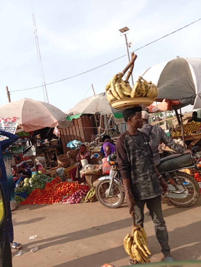 The image depicts an open-air market scene in Sabon Tasha, Nigeria, characterized by street vendors and market stalls under a clear sky