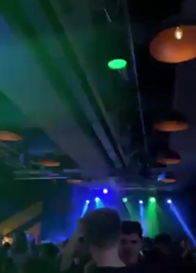 crowded nightclub with people dancing under colorful lights. The lights are green, blue, and white, and there are also several orange lamps hanging from the ceiling. The camera moves around to capture different angles of the crowd and lighting. The ceiling is low and industrial-looking, with visible beams and pipes.