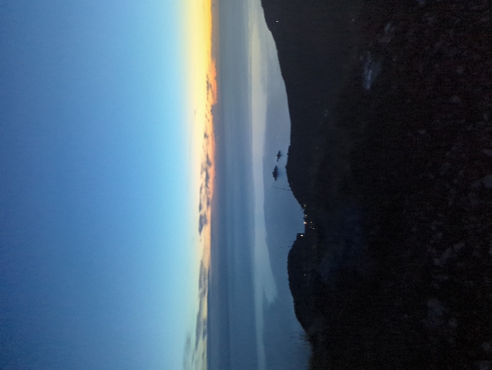 The image captures a serene landscape at dusk. The sky transitions from a deep blue to a soft orange hue near the horizon, where subtle clouds linger. Below, a body of water reflects the fading light, and beyond it, dark, silhouetted hills or mountains rise. The foreground is dominated by darkness, suggesting dense vegetation or rocky terrain. Small lights twinkle along the water's edge, hinting at a distant settlement.